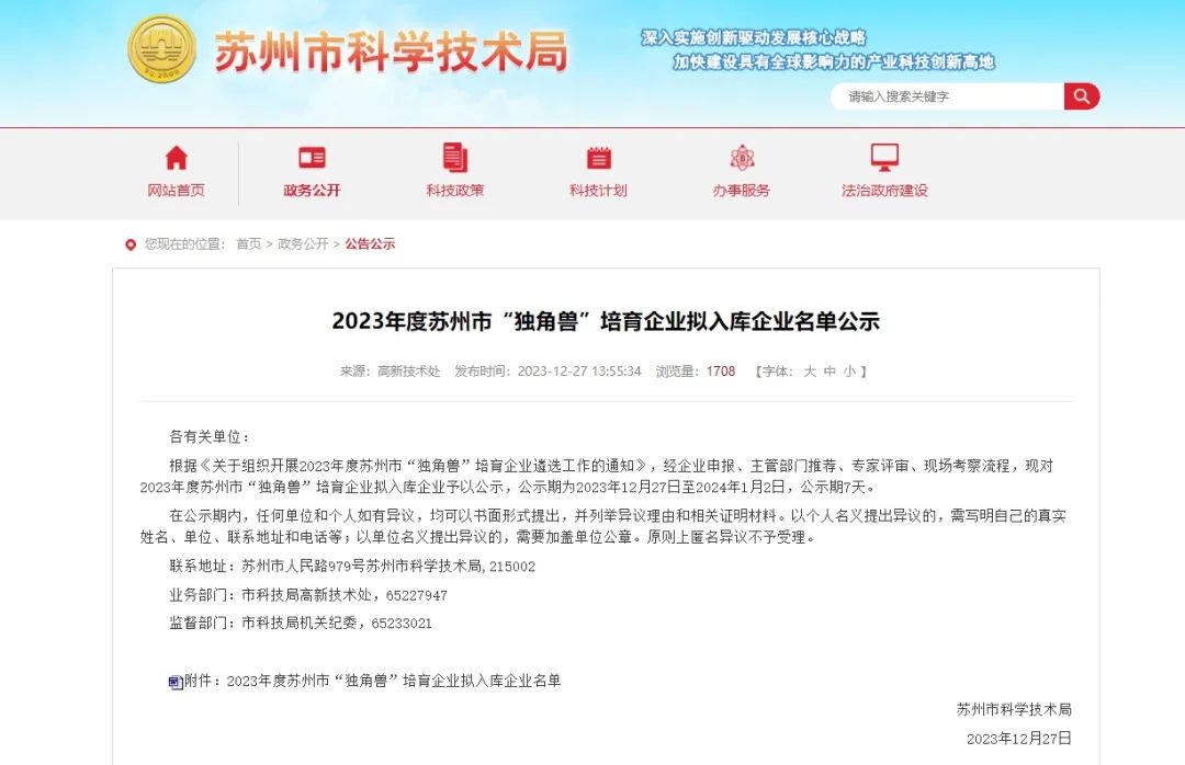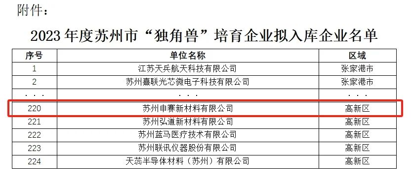 12月27日,苏州市科学技术局发布《2023年度苏州市“独角兽”培育企业拟入库企业名单公示》,不朽情缘(MG)新材料成功入选2023年度苏州市“独角兽”培育拟入库企业名单。